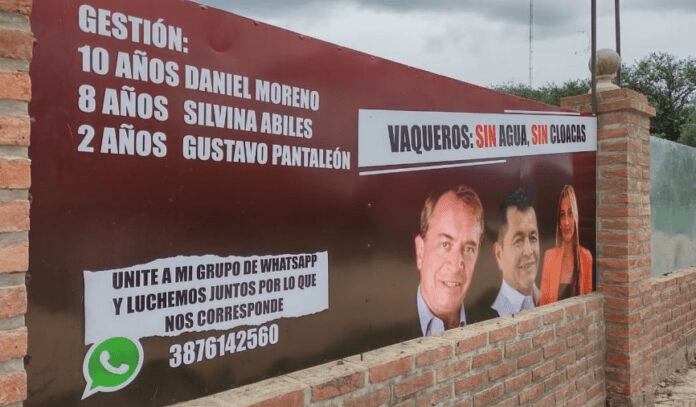 «Vaqueros sin agua y sin cloacas», reza un cartel en Vaqueros que apunta a los diez años que lleva al frente de ese municipio, Daniel Moreno. El intendente no tuvo mejor idea que salir a responder a quién hizo la pancarta y aseguró que tienentecedentes penales.