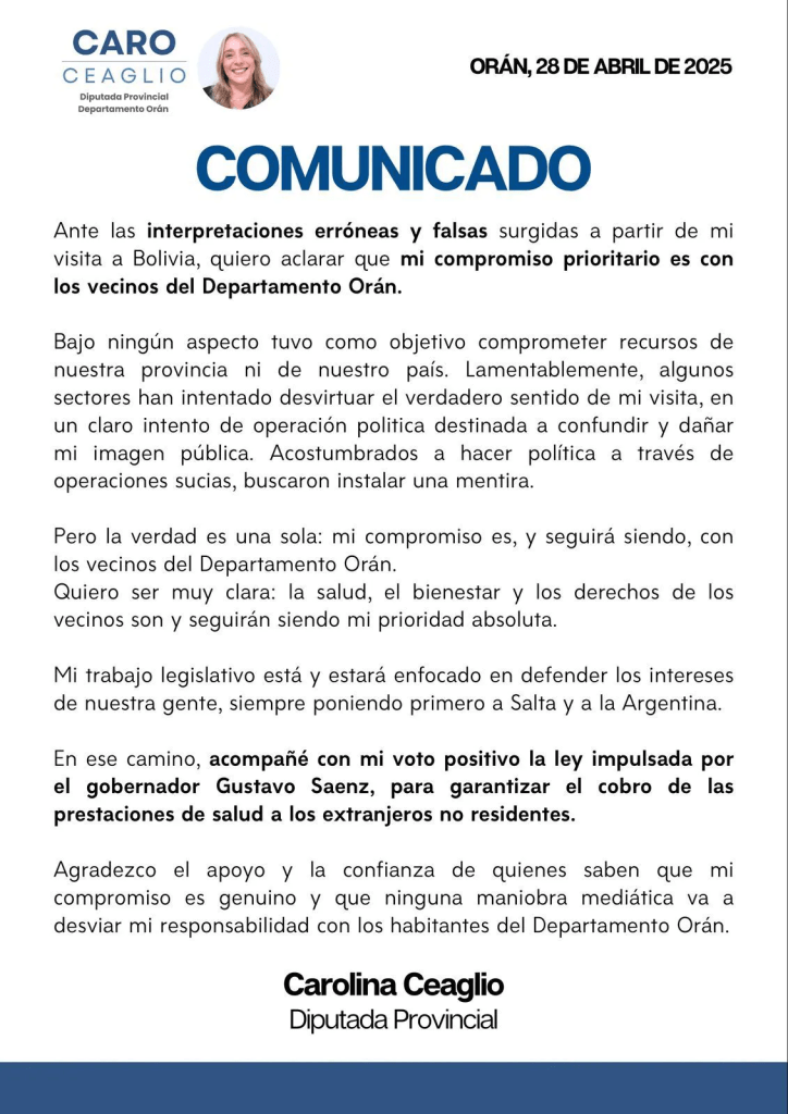 Ceaglio aclaró que su reciente visita a Bolivia no tuvo como objetivo comprometer recursos de la provincia de Salta ni del país. «Mi compromiso prioritario es y seguirá siendo con los vecinos del departamento de Orán», afirmó.